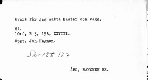 //// T //// Hvart får jag sätta hästar och vagn, IA. //// 10:2, R 3, 156, XXVIII. Uppt. Joh.Hagman. //// j ÅAr-fUrg /? ^L //// ÅBO, RANCKEN MS. ; //// i //// k. ™ ////
