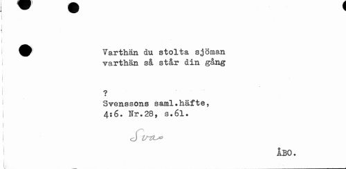 //// w v * //// ^^ Varthän du stolta sjöman //// ¦varthän så står din gång //// 9 * //// Svenssons saml*häfte, 4:6. Hr.28, s.6l. //// <J m //// I ÅBO. //// i ////