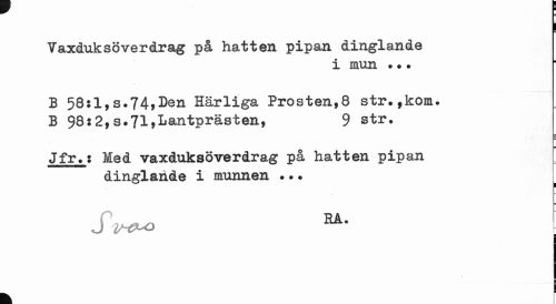 //// j //// Vaxduksöverdrag på hatten pipan dinglande //// i mun ... //// B 58:1,s.74,Den Härliga Prosten,8 str.fkom. B 98:2,s.71,Lantprästen, 9 str. //// Jfr.: Med vaxduksöverdrag på hatten pipan //// dinglande i munnen ?•. //// J HA# //// ¦ //// j //// k ////