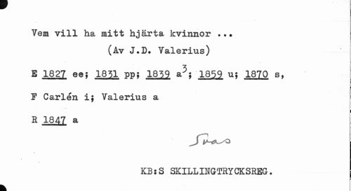 //// Vem vill ha mitt hjärta kvinnor //// (Av J.D. Valerius) //// E 1827 ee; 1851 pp; 1859 a3; 1859 u; 1870 s, //// F Carlén i; Valerius a //// * i //// L //// ... //// R 1847 a //// KBsS SKILLINGTRY CKSREG. j //// k ////