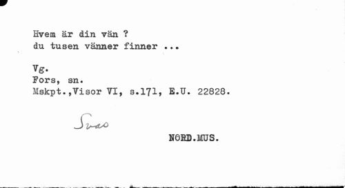 //// Hvem är din vän ? du tusen vänner finner •?. //// Vg. //// Fors, sn. //// Mskpt.,Visor Yl, s.171, E.U. 22828. //// NOED.MUS. //// _ . _ . .. ___- . . _ ___m.___M ' ////