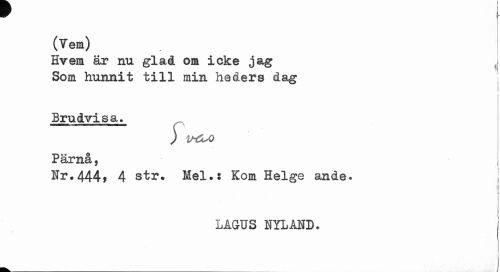 //// I //// (Tea) //// Hvem är nu glad om icke jag Som hunnit till min heders dag //// i //// Brudvisa. //// ) //// Pär nå, j //// t //// Nr.444, 4 str. Mel.s Kom Helge ande. j //// j //// j i //// LAGUS NYLAND. //// 1 I ////
