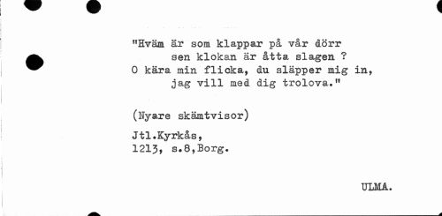//// "Hväm är som klappar på vår dörr ^^ sen klokan är slagen ? //// ^^ 0 kära min flicka, du släpper mig in, //// jag vill med dig trolova.11 //// (Nyare skämtvisor) Jtl.Kyrkås, //// 1213, s.8,Borg. //// ULMA. //// ^m^ a ////