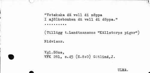 //// f, //// • 1. //// "Vetekaka dä vell di n8ppa I mj81kebonken dä vell di d8ppa.,f //// (Tillägg t.Landtiriansons "Källstorps pigor") Nidvisor. //// Vgl.Sone, //// ^ VPK 281, s.45 (H.8:0) Götlind,J. //// _ ULMA. ////