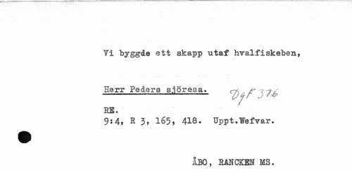 //// Ti byggde ett skapp utaf hval fiskeben, //// t //// Herr Peders sjöresa» RE • //// 9:4, E 3, 165, 418. Uppt.Wefvar. //// ÅBO, RÄUCKEN MS. ////