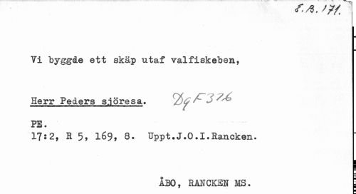//// o 'rr. //// Vi byggde ett skäp utaf valfiskeben, //// Herr Peders sjöresa. 2Sf n PE. //// 17:2, H 5, 169, 8. Uppt.J.O.I.Rancken. //// ÅBO, RAHCKEN MS. I ////