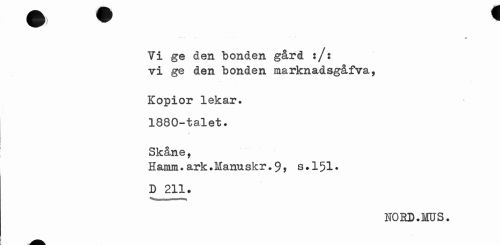 //// Vi ge den bonden //// gård :/: vi ge den bonden marknadsgåfva, //// Kopior lekar. 1880-talet. //// v //// Skåne, //// Hamm.ark.Manuskr.9, s.151. D 211. //// NOED.MUS. ////