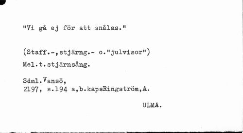 //// !,Vi gå ej för att snålas." //// (Staff.-fstjärng.- o."julvisor") Mel.t.stjärnsång. //// Sdml.^ansö, //// 2197? s.194 a,b?kapsHings tröm,A. //// ULMA. //// -___ ... . ^ . ^___- - -...-___ - - - - - - ////