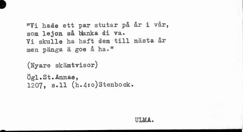 //// i //// ,fYi hade ett par stutar på år i vår, som lejon så blanka di va. ¥i skulle ha haft dem till nästa år men pänga ä goe å ha.M //// (Nyare skämtvisor) Ögl.St.Annae, //// 1207, s.ll (h.4Jo)Stenbock. //// ULMA. //// t ¦ jr ////