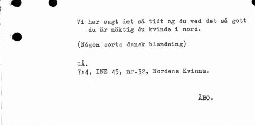 //// I //// Ti har sagt det så tidt og du ved det så gott ^^ du är mäktig du kvinde i nord. //// (Någon sorts dansk blandning) //// o //// ¦IA. //// 7:4, INE 45, nr.52, Nordens Kvinna. //// ABO. ////