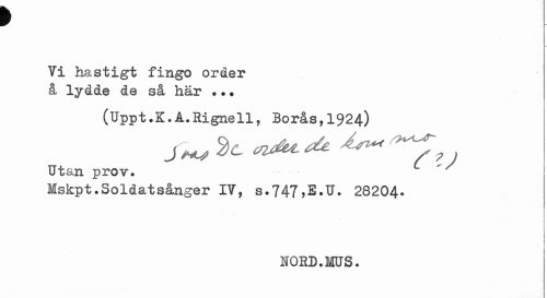 //// f //// Yi hastigt fingo order å lydde de så här ? . ? //// (Uppt.K.A.Rignell, Borås,1924) Utan prov. //// Mskpt. Soldat sånger IV, s.747 ,E.U. 28204. //// • ] //// I //// < //// i ) //// NORD. MUS. ////
