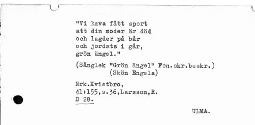 //// u \ //// "Yi hava fått sport att din moder är död och lagder på bår och jordats i går, grön ängel." //// (Sånglek "Grön ängel" Pon.skr.beskr*) //// (Skön Engela) //// Nrk.Kvistbro, //// 41?155>s.36,Larsson,R. //// ULMA. ////