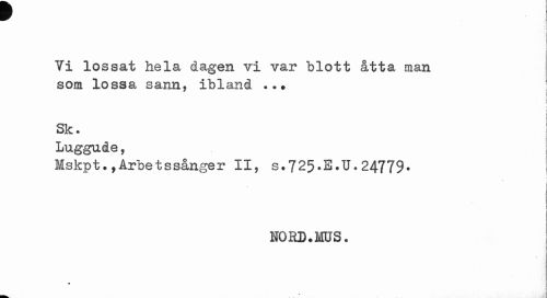 //// Vi lossat hela dagen vi var blott åtta man //// som lossa sann, ibland ..• //// * //// i //// ! j //// Sk. //// Luggude, //// Mskpt.,Arbetssånger II, s.725.E.U-24779. //// ¦ //// I //// NOED.MUS. //// f ////