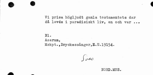 //// Ti prisa högljudt gamla testamentets dar då levde i paradisiskt liv, en och var ... //// Bl. //// Asarum, //// Mskpt.,Dryckessånger,E.U.19154. //// HORD. MUS. ////