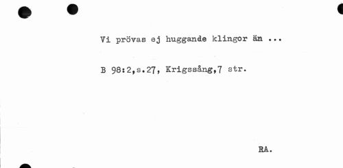 //// Vi prövas ej huggande klingor än ?.. B 98:2,s.27, Krigssång,7 " str. //// RA. ////