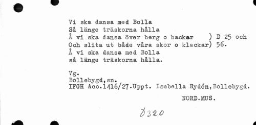 //// [B m //// Yi ska dansa med Bolla Så länge träskorna hålla //// A vi ska dansa över berg o backar ) D 25 och Och slita ut både våra skor o klackar) 56» Å vi ska dansa med Bolla så länge träskorna hålla. //// Vg. //// Bollebygd,sn. //// IFGH Acc.l4lé/27.Uppt. Isabella Rydén,Bollebygd. //// NORD.MUS. //// iwo ////