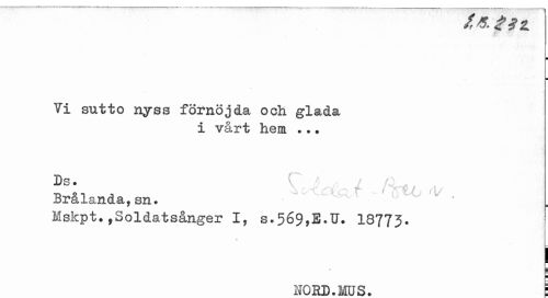 //// i? t //// it //// ¦ //// Ti sutto nyss förnöjda och glada //// i vårt hem ..? //// Ds. //// Brålanda,sn. 0 //// Mskpt.,Soldatsånger I, s.569,E.U. I8773. //// i ¦ //// NORD. MUS. i ////
