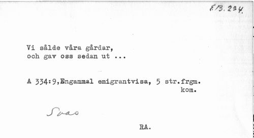 //// ! //// % //// i //// Vi sålde våra gårdar, och gav oss sedan ut ... //// A 334:9,Engammal emigrantvisa, 5 str.frgm. //// i //// kom. //// SA. | ////