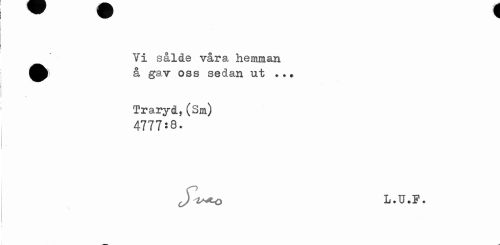 //// w v ^ //// Vi sålde våra hemman ^p) å gav oss sedan ut //// / //// Traryd,(Sm) 4777:8. //// t) L.U.F. ////