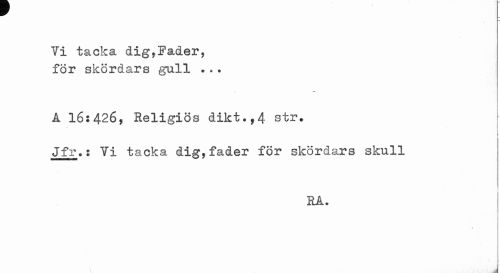 //// Ti tacka dig,Fader, för skördars gull ..? //// A 16:426, Religiös dikt.,4 str. //// Jfr.: Ti tacka dig,fader för skö] skull //// RA. ////