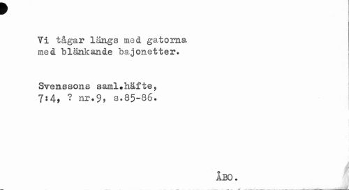 //// w //// Vi tågar längs med gatorna med blänkande bajonetter. //// Svenssons saml.häfte, 7*4, ? nr.9, s.85-86. //// ÅBO. ////