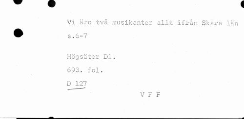 //// Vi äro två musikanter allt ifrån Skara län //// Högsäter Dl. 693. fol. //// * //// D 127 //// V F F ////