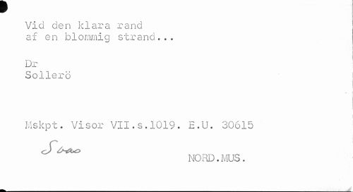 //// w //// Vid den klara rand af en blommig strand... //// Dr : //// Sollerö ! //// i //// i //// I //// Mskpt. Visor VII.s.1019. E.U. 30615 //// c) //// NORD. MUS. ////