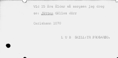//// V" //// Vid 15 års ålder så sorgsen jag drog se: Jätten Gällas dörr //// Carlshamn 1870 //// L U B SKILL:TR PROSAREG. ////