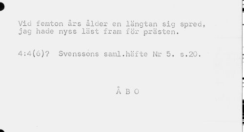 //// 9 i //// Vid femton års ålder en längtan sig spred, jag hade nyss läst fram för prästen. //// 4:4(6)? Svenssons saml.häfte Nr 5. s.20. - //// ¦ //// ÅBO ////