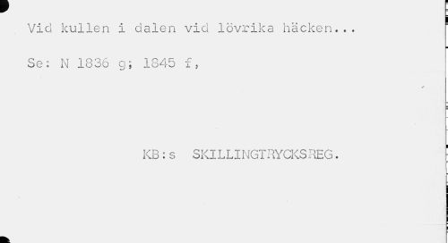 //// W p //// Vid kullen i dalen vid lövrika häcken... Se: N 1836 g; 1845 f, //// KB :s SKILLINGTRYCKSREG. f //// = //// ¦ //// ¦ ////