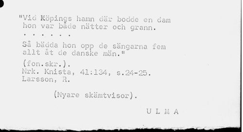 //// f //// nVid Köpings hamn där bodde en dam //// hon var både nätter och grann. • * . * * « » //// Så bädda hon opp de sängarna fem allt ät de danske män.11 //// (fon.skr.) . //// Nrk. Knista, 41:134, s.24-25. Larsson, R. //// (Nyare skämtvisor). //// U L M A ////