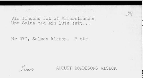 //// 'T' ¦ - «" % --- - - r " • „ , . , t //// ;'' ' .:' ... : Jrj //// Vid lindens fot af Mälarstranden Ung Selma med. sin luta satt... //// Nr 377, Selmas klagan? 8 str. //// Jl^yo AUGUST BONDESONS VISBOK ( ////