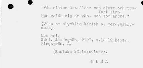 //// ^^ nVid nitton års ålder med glatt och tro- //// fast sinn //// han valde sig en vän, han som andra.u //// (Visa om olycklig kärlek o. mord,självmord) . //// Med mel. //// Sdml. Strängnäs, 2197, s.10-12 kaps.. Ringström, A. //// (Enstaka kärleksvisor). //// U L M A ////