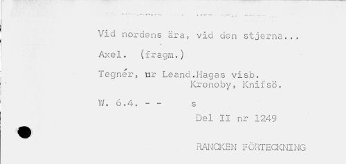 //// Vid nordens ära, vid den stjerna... //// » //// Axel. (fragm.) //// Tegnér, nr Leand.Hagas visb. //// Kronoby, Knifsö. //// W. 6 .4 • - - s //// Del II nr 1249 RANCKEN FÖRTECKNING ////