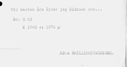 //// p //// Vid sexton års ålder jag älskade ren... //// Se: G 62 //// E 1842 a; 1870 p //// KB:s SKILLINGTRYCKSREG. //// > ////