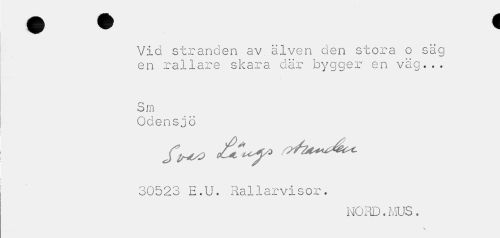 //// Vid stranden av.älven den stora o säg en rallare skara där bygger en väg... //// om //// 1 « » « //// Odensjo //// 30523 E.U. Rallarvisor. //// NORD.MUS. //// V ////