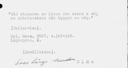 //// > //// "Vid stranden av älven den stora o säg en arbetarskara där bygger en väg." //// (Rallarvisa). //// E //// Upl. Nora, 9587, s. 167-169. Lagergren, E. //// (Ge s 3. llvisor). I //// Ja^ r^^^ u L M A ////