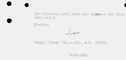 //// Vid stranden satt Anna med blkmmor och blad ^^ (mel.not.) //// Enviken //// Mskpt. Visor VII.s.381. E.U. 28891. //// MORD.MUS. ////