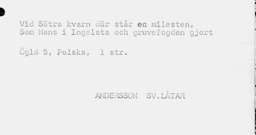 //// t I //// Vid Sätra kvarn där står en milesten, Som Hans I Ingelsta och gruvefogden gjort //// te * //// Ogld 5, Polska, 1 str. //// i //// ANDERSSON SV.LÅTAR ////