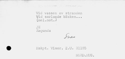 //// ; 'c' ' ^ ** ' **" «• V- *" *¦ i //// Vid vassen av stranden Vid sorlande bäcken... //// (mel.not.i * * //// ja //// Ragunda //// JP Mskpt. Visor, E.U. 31185 //// NORD.MUS. ////