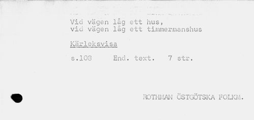 //// ' f • • « •• • • ' • . 7 T //// •v •» -r-- //// * - ¦ * -r_ , n * ¦ , e , « ' //// Vid vägen låg ett hus. //// vid vägen låg ett timmermanshus //// Kärleksvisa //// s.103 End. text. 7 str. ^ ROTHMAN ÖSTGÖTSKA FOLKM. ////