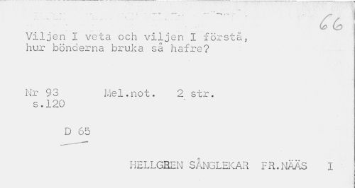 //// • « ^ r •*• j^Pj //// Viljen I veta och viljen I förstå, hur bönderna bruka så hafre? //// Nr 93 Mel.not. 2 str. //// s.120 //// D 65 //// HELLGBEN SÅNGLEKAR FR.NAÄS I ' ////