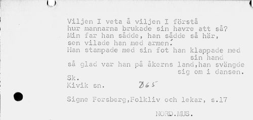 //// \ -J M //// Viljen I veta å viljen I förstå hur mannarna brukade sin havre att så? Min far han sådde, han sådde så här, sen vilade han med armen T Han stampade med sin fot han klappade med //// sin hand //// så glad var han på åkerns land,han svängde //// sig om i dansen. //// r^i i //// Kivik sn. //// ^ Signe Forsberg,Folkliv och lekar, s.17 //// NORD.MUS. ////