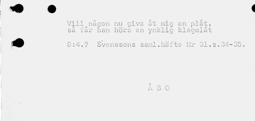 //// Villonågon nu giva åt mig en plåt, sa far han höra en ynklig klagolåt //// 8:4.? Svenssons sarnl.häfte Nr 31. s. 34-35. //// Å B 0 //// \ //// \ ////