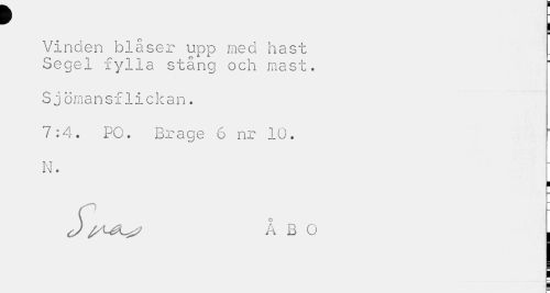 //// Vinden blåser upp med hast Segel fylla stång och mast. //// Sjömansflickan. //// 7:4. PO. Brage 6 nr 10. //// N. //// ¦ //// ÅBO I ////