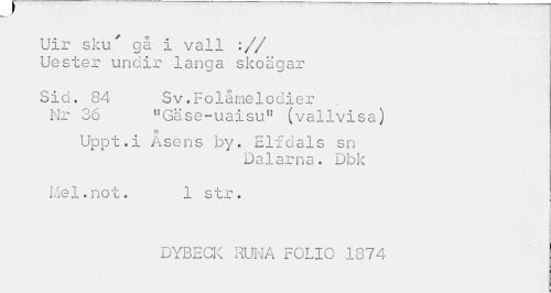 //// Uir sku' gå i vall :// Uester undir langa skoägar //// Sid. 84 Sv.Folåmelodier //// X //// Nr 36 ,rGäse~uaisun (vallvisa) //// o //// Uppt.i Åsens by. Elfdals sn //// Dalarna. Dbk //// Mel.not. 1 str. //// DYBECK RUNA FOLIO 1874 ////