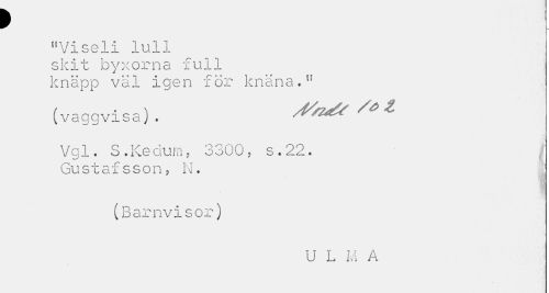 //// f [ //// "Viseli lull //// skit byxorna full //// knäpp väl igen för knäna." //// (vaggvisa) . /MtZäU //// Vg 1. S.Kedum, 3300, s.22. Gustafsson, N. //// (Barnvisor) //// U L M A ////