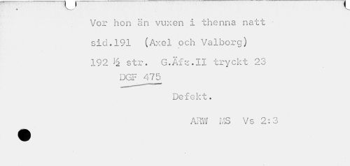 //// Vor hon än vuxen i thenna natt 1 //// sid.191 (Axel och Valborg) //// 192 >2 str. G.Äfa.II tryckt 23 //// DGF 475 //// Defekt. //// ARW MS Vs 2:3 //// i ////