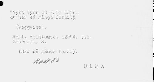 //// "Vyss vyss du kära barn, ' //// du har så många farar.fi, //// (Vaggvisa)* //// Sdml. Stigtomta, 12054, s.8. //// <Ehornell, S. : //// (Har så många farar). ( //// U L M A I ////