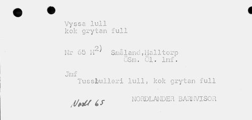 //// Vyssa lull kok grytan full //// 2) //// Nr b5 Ii Smaland»Halltorp //// c V <0 e *• //// GSm* :. i. Imf. //// Jmx //// Tusslbulleri lull, kok grytan full iJtltf i? NORDLANDER BARNVISOR ////